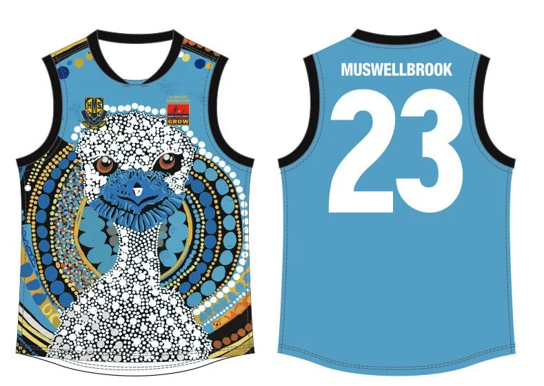 This version of The Journey of Narlu was reimagined by Keira Graham to honour her father Ben, Director of the Clontarf Academy at Muswellbrook High School. Unlike her earlier Narlu pieces, this one was created with new intention and colours—drawing from the school’s palette of navy, yellow, and light blue. The artwork now features on the students’ sports uniforms, symbolising journey, growth, and the strength that comes from walking forward—together.